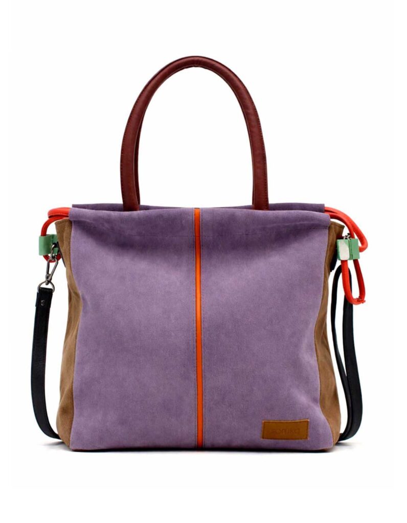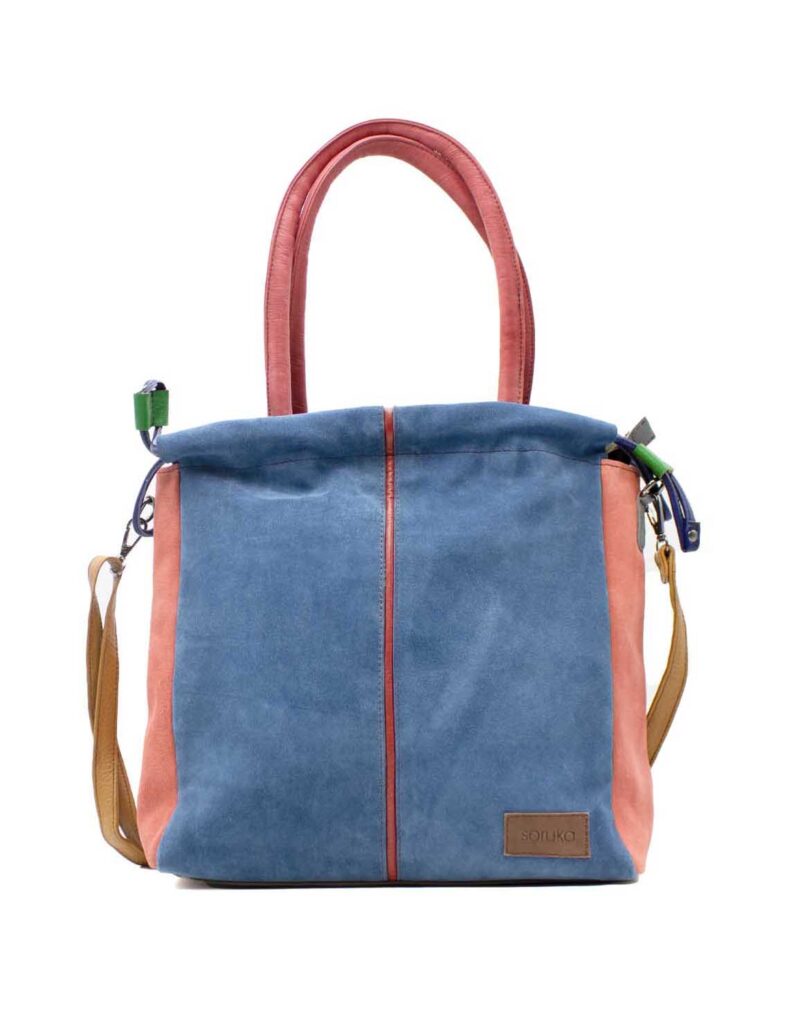 Women’s shoulder bag · Two-tone recycled leather · Handmade · Double handles and adjustable shoulder strap · Large capacity for everyday use