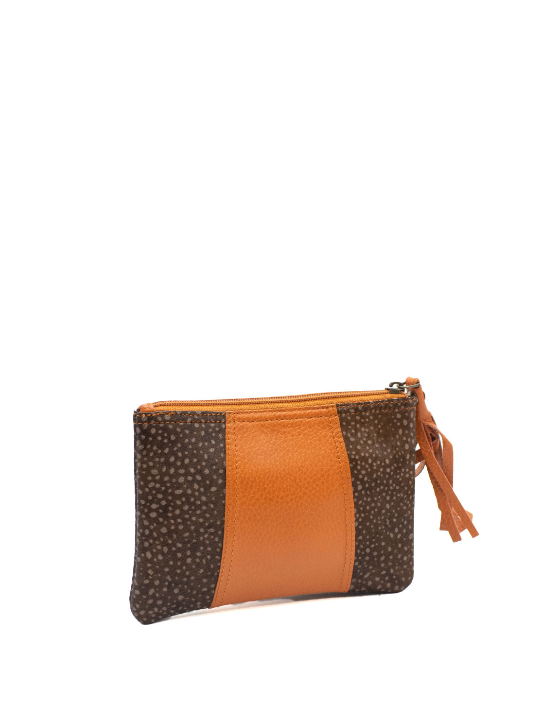 The pouch contains a main department that includes 3 credit card slots and an inside zipper coin pocket. It fastens with a zipper strap with a leather ornament for easy opening.